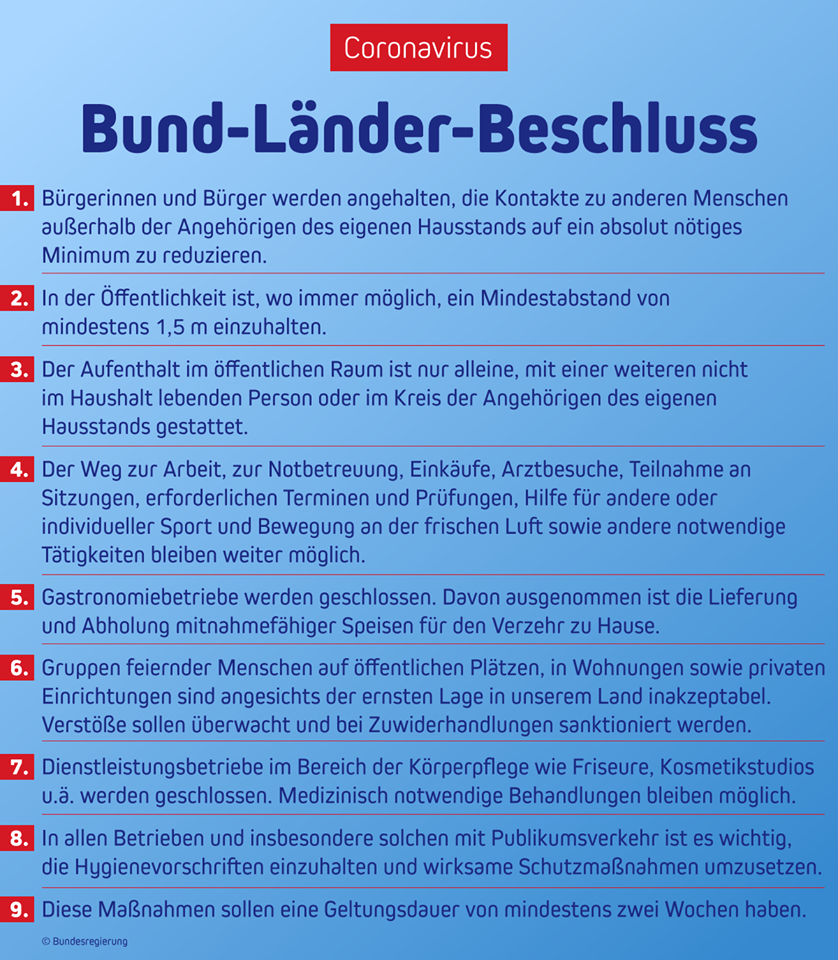 Um einen unkontrollierten Anstieg der Coronavirus-Infektionen zu verhindern und unser Gesundheitssystem leistungsfähig zu halten, haben sich Bund und Länder auf weitere Maßnahmen zur Beschränkung sozialer Kontakte geeinigt. Hier das Wichtigste im Überblick.